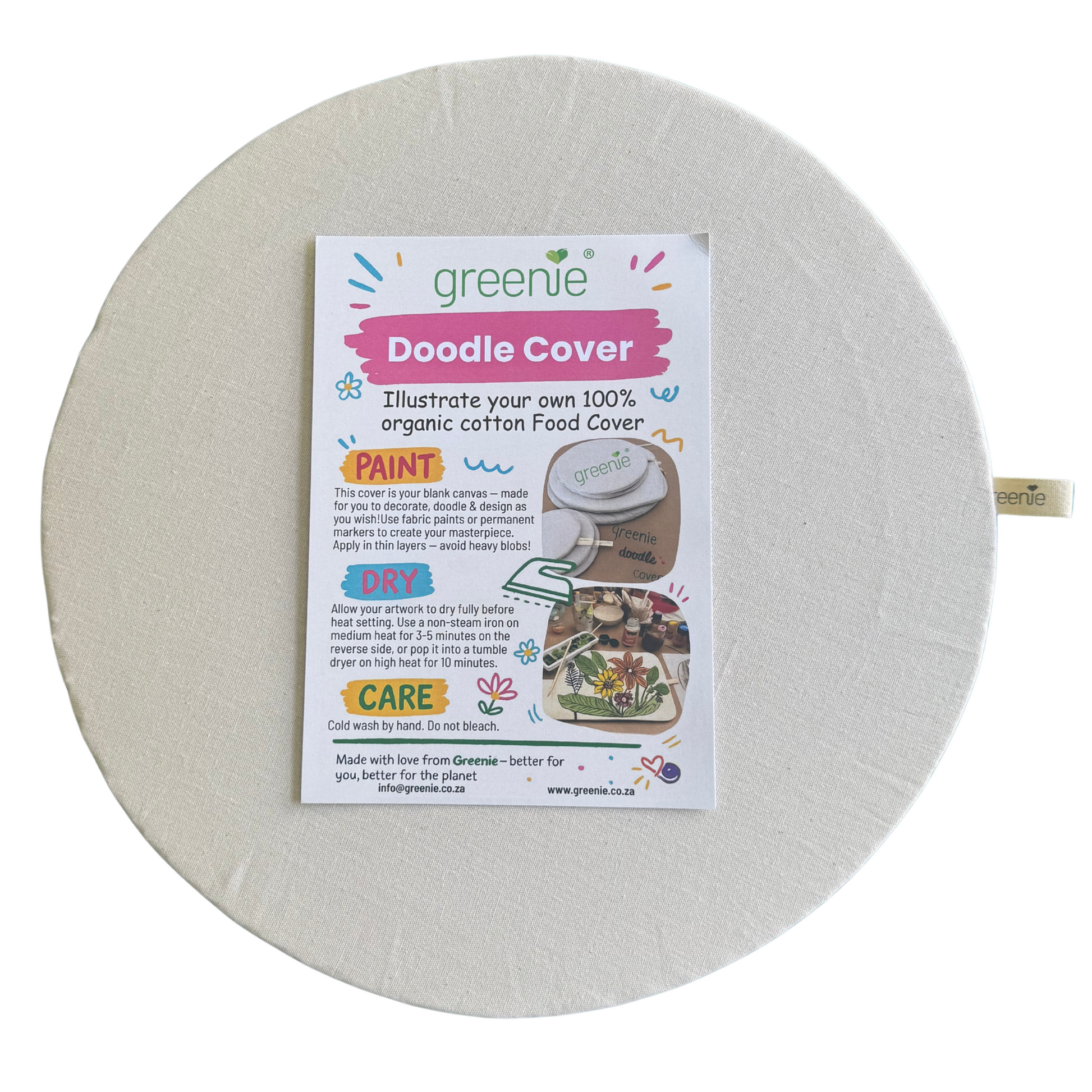 Our Greenie Doodle Food Cover is where creativity meets practicality. Made from GMO-free organic cotton, this large 34cm cover fits salad bowls, mixing bowls, and serving dishes – keeping food fresh while letting your imagination run wild.