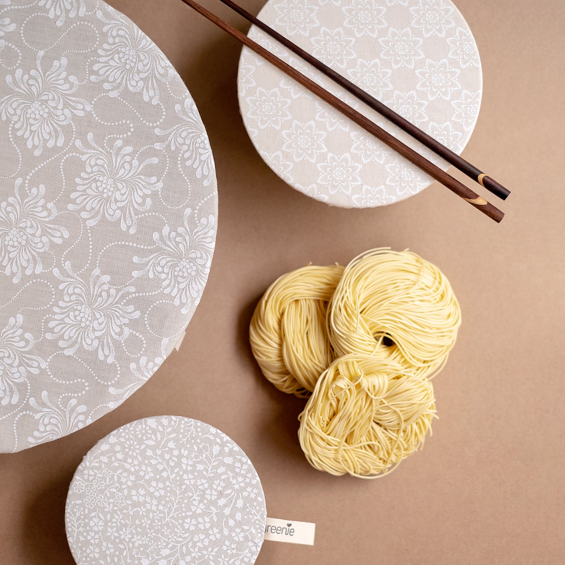 Choose from a set of three (3) or a set of six (6). Handmade to the high manufacturing standards associated with all Greenie products from 100% GMO free cotton. The mix of subtle prints is perfect to complement any setting. The easy answer to eliminating plastic wrap in your home.