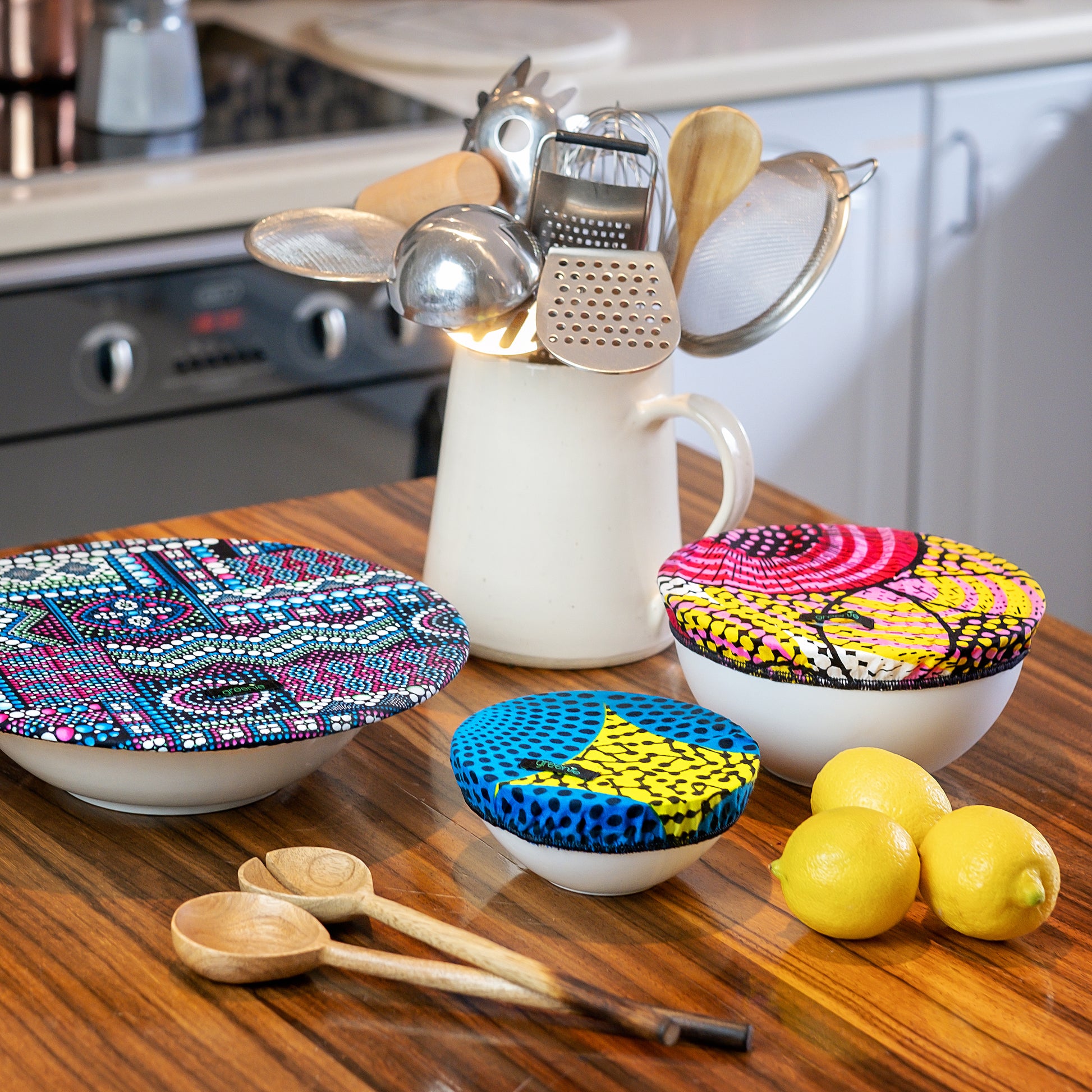 The 100% cotton fabric allows for air and steam to escape. All fabrics have been pre-shrunk and are machine washable. Bright colours may run, so wash separately. Covers are hand stitched and finished with elastic on the edges to ensure a snug fit around various container sizes.