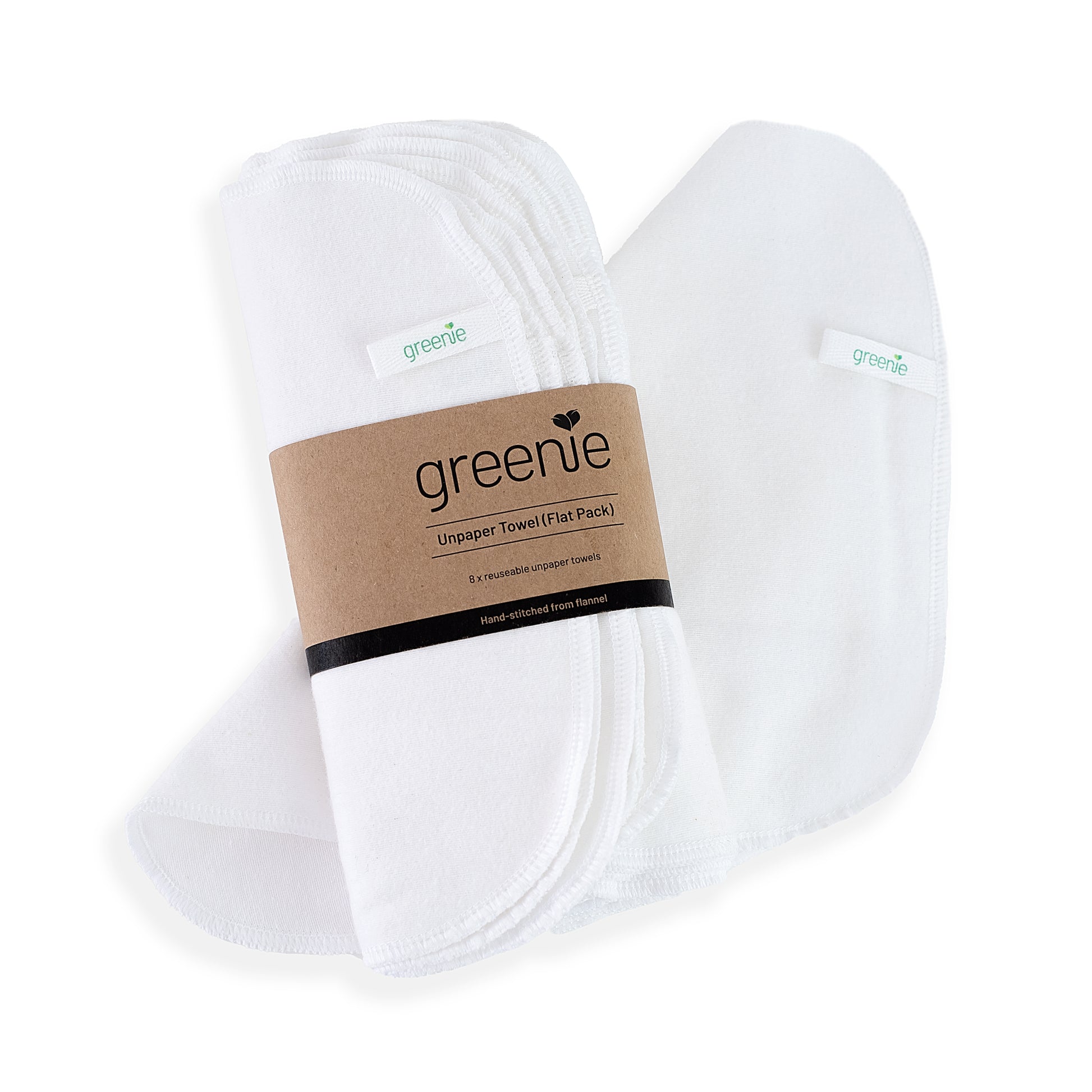 Our Unpaper Towels are the perfect way to reduce the usage of paper towels in your kitchen. Hand stitched using two layers of absorbent flannel, these miracle cloths can deal with any kitchen spill. The more they are used and washed, the more absorbent they will become. Our design allows for them to be rolled and rerolled in packs of eight. The Flat Pack includes eight Unpaper Towels. No clips or velcro, so super easy to use. Has a fabric loop to hang it in your kitchen on a hook if needed.